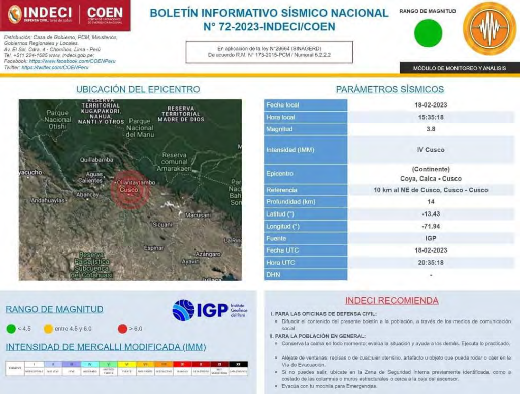 Un temblor de magnitud 3.8 ocurrió este sábado 18 de febrero en la región del Cusco, el epicentro fue en Coya en la provincia de Calca, informó el Instituto Geofísico de Perú (IGP).
