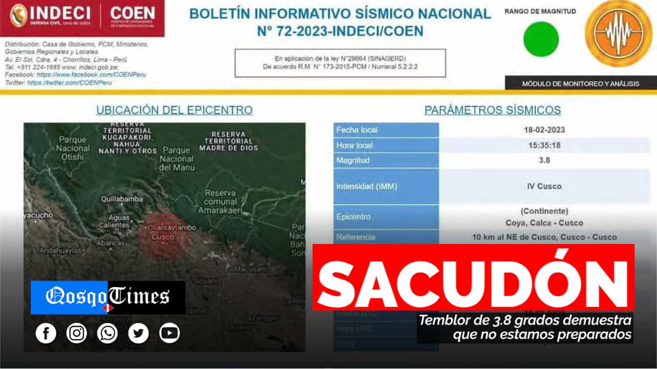 Un temblor de magnitud 3.8 ocurrió este sábado 18 de febrero en la región del Cusco, el epicentro fue en Coya en la provincia de Calca, informó el Instituto Geofísico de Perú (IGP).