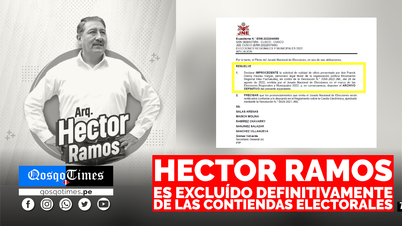 El Jurado Nacional de Elecciones, emitió una resolución donde declara improcedente la solicitud de nulidad de oficio presentada por el personero legal del Movimiento Regional Inka Pachakuteq, dejando fuera de estas elecciones a Hector Ramos, ex candidato al distrito de San Sebastián.