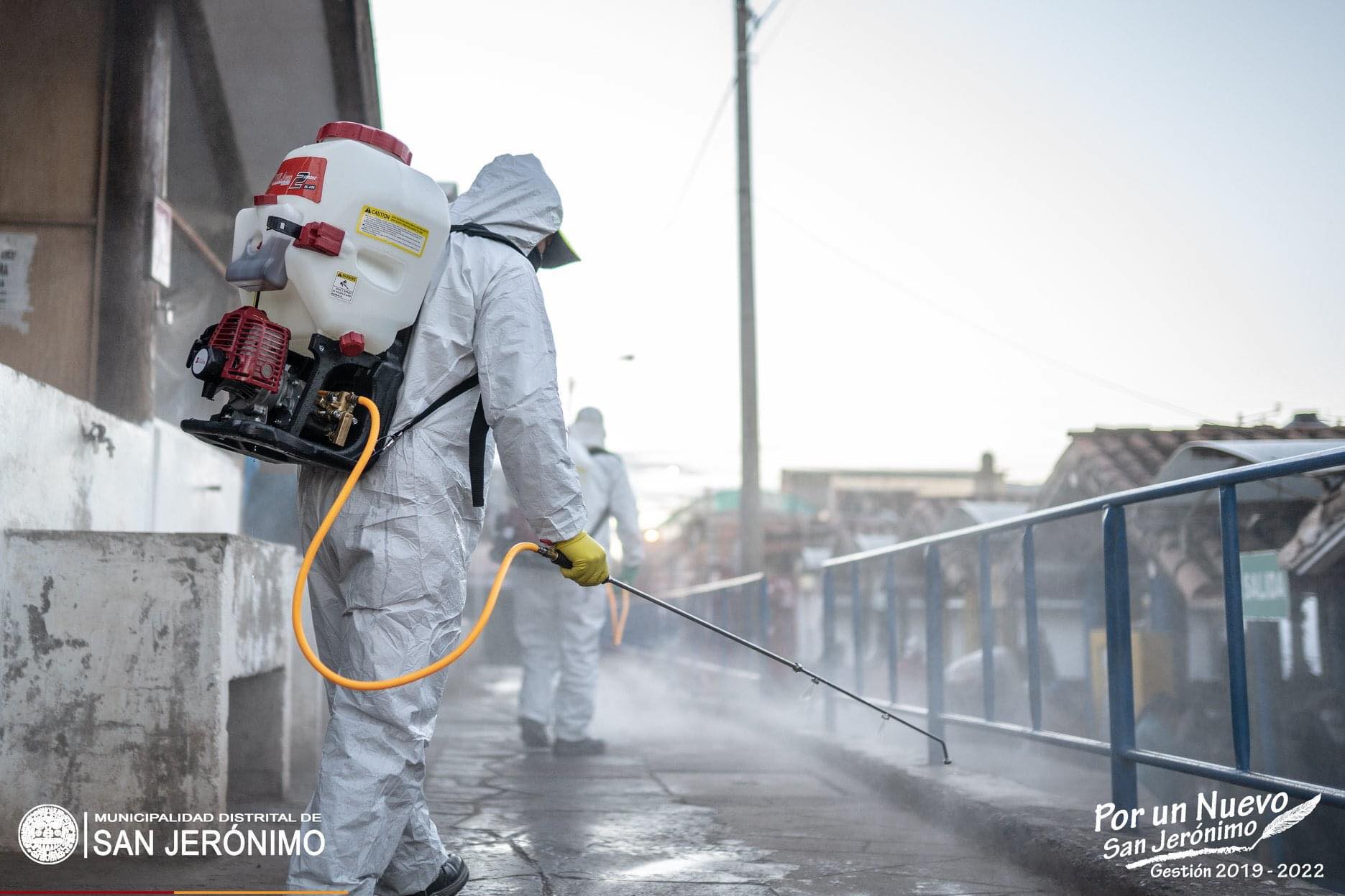 La limpieza, fumigación y desinfección se realiza constantemente en todo el distrito de San Jerónimo; en las diferentes APVs. y de manera permanente dentro y fuera del mercado Vinocanchon donde también se puso la señalética para mantener el metro de distancia dentro del mercado para poner orden al momento de realizar sus compras.