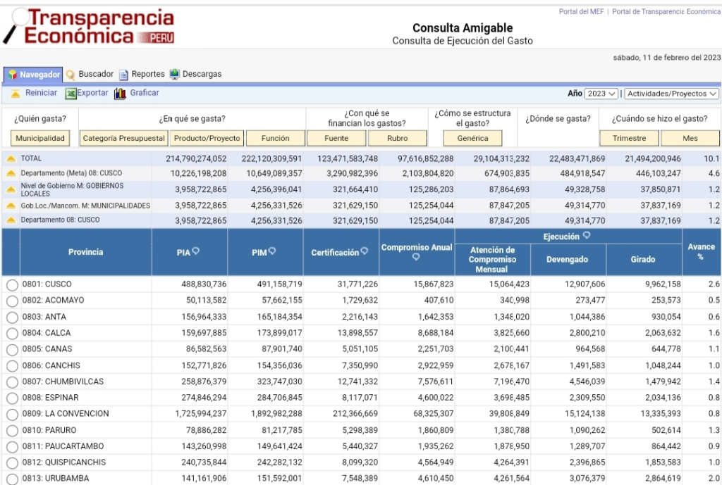 Según consulta a la plataforma web del Ministerio de Economía y Finanzas (MEF) del 10 de febrero del año en curso respecto al gasto presupuestal que registran los gobiernos provinciales de la región cusqueña, se observa que hay algunos con 0% de inversión y la gran mayoría con 1% de ejecución presupuestal.
